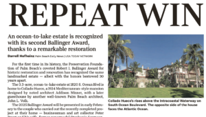 For the first time in history, the Preservation Foundation of Palm Beach’s coveted Robert I. Ballinger Award for historic restoration and renovation has recognized the same landmarked estate — albeit with the honors bestowed 30 years apart. The 3.3 acre, ocean-to-lake estate at 1820 S. Ocean Blvd is home to Collado Hueco, a 1924 Mediterranean-style […]